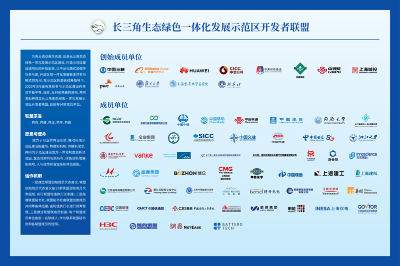 示范区揭牌以来,“朋友圈”越来越大,建设者来自我国四面八方。各类市场主体、专业机构高度关注,中国三峡集团、华为公司、阿里巴巴、复旦大学等各类高能级主体主动对接长三角示范区执委会交流探讨、洽谈合作,于2020年8月发起成立长三角生态绿色一体化发展示范区开发者联盟(简称“开发者联盟”)。