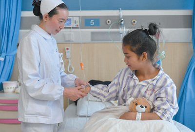 2018年6月,6名柬埔寨先心病患儿在云南省阜外心血管病医院接受免费治疗。图为护士为一名患儿检查身体。 |