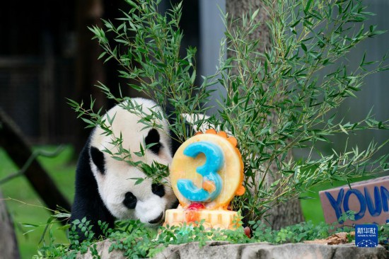 据介绍,蛋糕顶部醒目的数字“3”由冰冻稀释苹果汁和菠萝汁制成,蛋糕上点缀着苹果、红薯、胡萝卜和竹子,还涂抹上红薯泥、胡萝卜泥和蜂蜜等。