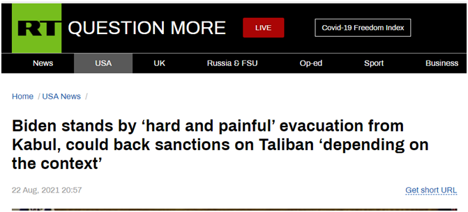 RT:拜登支持从喀布尔“艰难而痛苦”地撤军,并表示可能支持对塔利班的制裁,但视情况而定