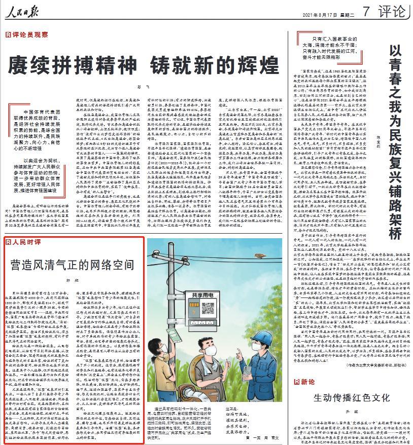 人民日报8月17日发表《人民日报:营造风清气正的网络空间》指出,“饭圈”乱象表现形式多样,给治理带来了不小的挑战。这背后,既有盘根错节的资本和利益链条,也有泛娱乐化等不良倾向和“流量至上”、拜金主义等畸形价值观。根治畸形“饭圈”文化,需要多措并举、标本兼治,既切除病灶,也铲除病根。接下来,继续加强监管,压实平台主体责任,形成长效机制,让越出底线者付出代价,让非法逐利者受到惩罚,才能凝聚合力、久久为功,更好维护风清气正的网络空间。