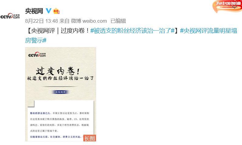 央视网两度发文表态。8月23日央视网发表题为《过度内卷!被透支的粉丝经济该治一治了》文章指出,明星、资本和平台各取所需,各有所获,明星名气大了,资本市场估值高了,平台流量升了,一个个赚得盆满钵满,唯独粉丝成了“冤大头”。这种流量至上的玩法获利高、见效快,但实际上只是资本在搞流量的“大水漫灌”,催生的只是泡沫,制造的是虚假繁荣。而且,当同质化明星的流量被瓜分完毕,无法通过异质化内容和作品带来粉丝增量,粉丝间的“内卷”现象就必然产生,匪夷所思的“倒牛奶”式乱象就难以避免。