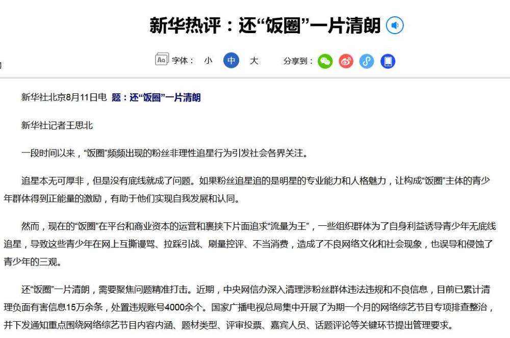 8月11日,新华网发表《新华热评:还“饭圈”一片清朗》指出,现在的“饭圈”在平台和商业资本的运营和裹挟下片面追求“流量为王”,一些组织群体为了自身利益诱导青少年无底线追星,导致这些青少年在网上互撕谩骂、拉踩引战、刷量控评、不当消费,造成了不良网络文化和社会现象,也误导和侵蚀了青少年的三观。