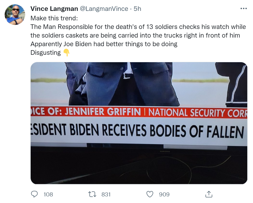 美国前总统特朗普的支持者文斯·兰格曼在推特上说:“当士兵的灵柩被抬上车时,应对13名士兵死亡负责的人正在查看手表。显然,乔·拜登应该做得更好。恶心。”