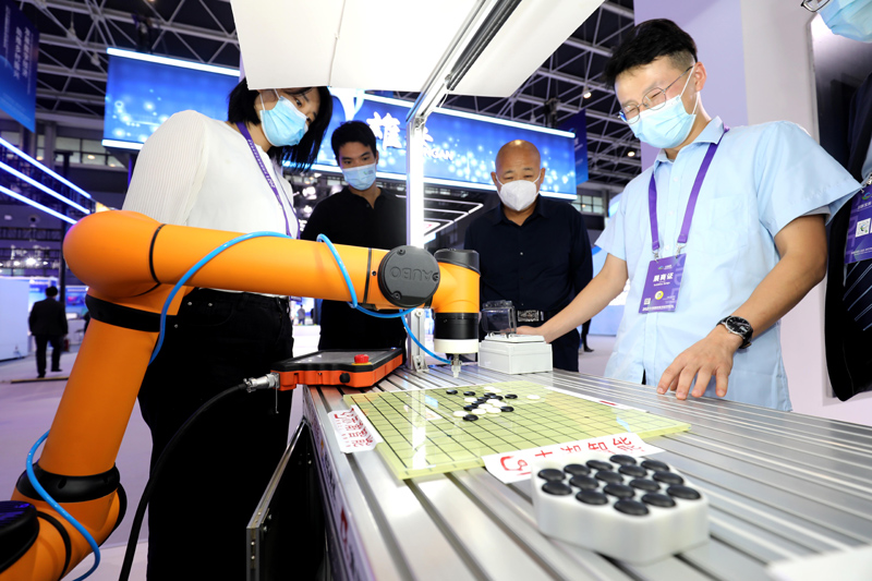 9月6日,参展商在博览会上演示与智能机器人进行围棋互动。