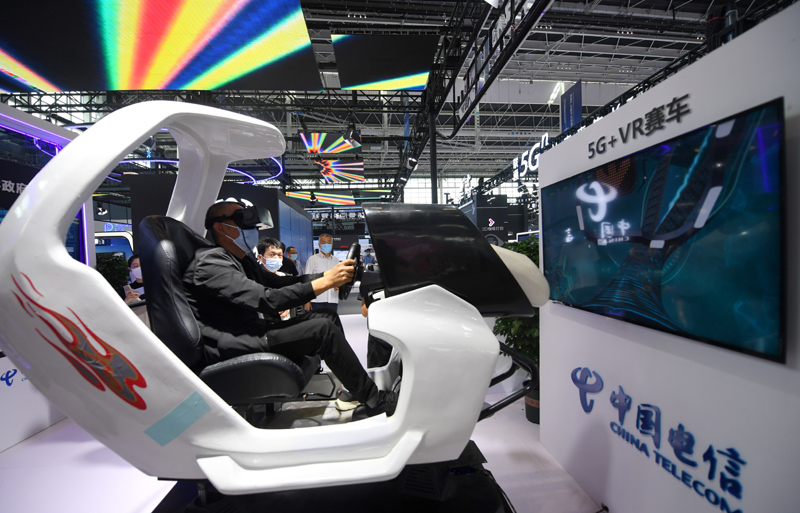 9月6日,参观者在体验5G+VR赛车。