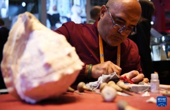 11月6日,璐索贝雕首席雕刻师奇罗·埃斯波西托在上海的第七届进博会上展示贝雕技艺。