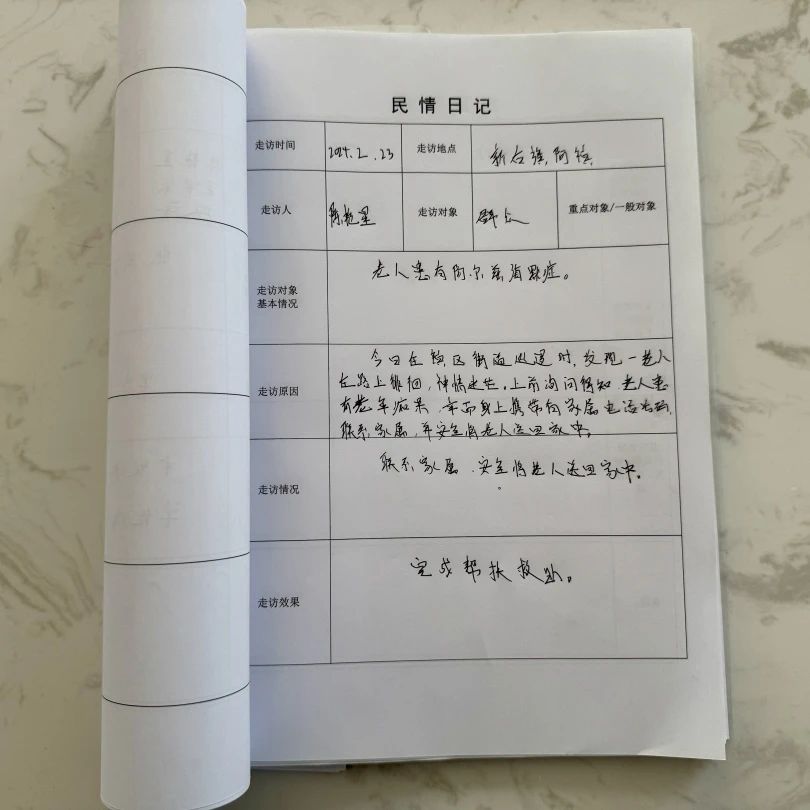 “刘家兄弟因赡养老人一事经常发生争吵,已进行调解。”“走访时了解到,赵大哥家和小李家发生土地纠纷,赵大哥想再沟通一下,约在了周三。”“付大爷家的院子存在安全隐患,我们联系村干部实地看了,草垛已移至安全位置……”翻开兴安盟扎赉特旗公安局新林派出所所长马为富的民情日记,上面记满了走访对象的基本情况、存在困难以及解决措施、完成进度。一本本民情日记,成了马为富工作中不可缺少的“帮手”。“基层工作千头万绪,我刚入警时,总担心有遗漏,就开始记工作记录,居民有什么诉求,我翻开本子就能一目了然。”
