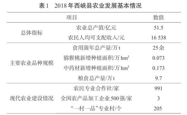 河南省西峡县抓住农业供给侧结构性改革先机,优化农业结构,不断扩大特色农业基地规模,加强县域品牌建设,深化产业融合,建设现代农业强县,全力推进“菌、果、药”三大特色产业提质增效,使农业发展得到质的提升。表1为2018年西峡县农业发展基本情况。