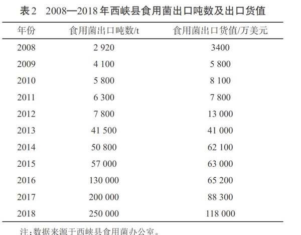 1.2.1 食用菌产业。西峡县形成了“一菌为主、多菌发展”的产业格局,该县食用菌产业主要种植香菇,年产保持在8 000万袋左右。西峡县食用菌办公室相关数据统计显示,2017年,该县食用菌出口货值达8.8亿元,出口吨数达20万t;2018年,该县食用菌出口货值为11.8亿元,出口吨数达25万t。表2为2008—2018年西峡县食用菌出口吨数和出口货值,数据显示2008—2018西峡县食用菌出口吨数不断增长,出口货值快速上涨,该县对外开放程度不断加强。