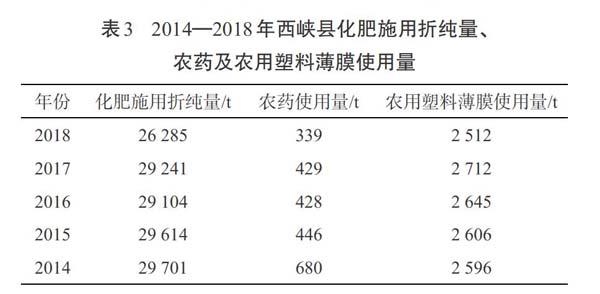 西峡县在农业生产中需要使用大量农用塑料薄膜,尤其是食用菌行业。难以自然降解的农用塑料薄膜造成“白色污染”,降低土壤肥力和土壤渗透性,同时在残膜分解的过程中会释放出锡、铅等有毒化学物质,再次污染土壤。表3为2014—2018年西峡县化肥施用折纯量、农药使用量、农用塑料薄膜使用量的相关数据。表3数据显示近年来西峡县化肥使用量、农药使用量虽不断减少,但减少量较少,同时整体仍处于较高水平;2014—2017年该县农用塑料薄膜使用量逐年增加,2018年农用塑料薄膜使用量较2017年减少,但相对于其他县域使用量较高。